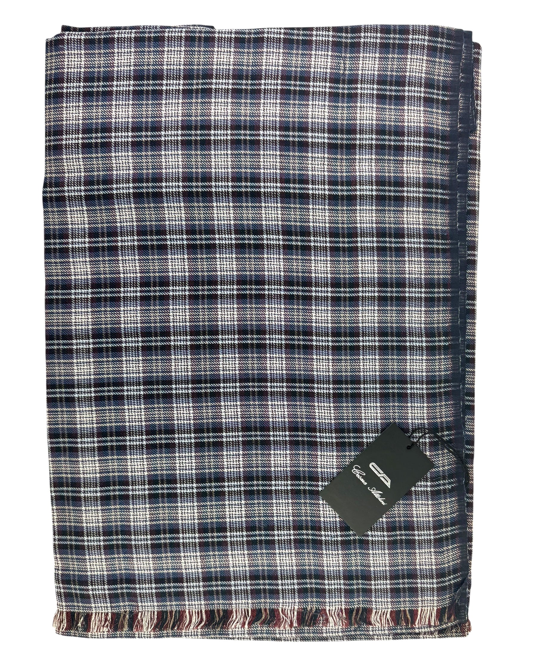 Genuine Attolini scarf, large, midnight blue black maroon check plaid, short eyelash fringe, fancy lightweight cashmere/ silk, made in Italy. Cesare Attolini: sartorial quality men designer shawls and scarves, men collection at outlet prices. Shop discount Attolini scarves.