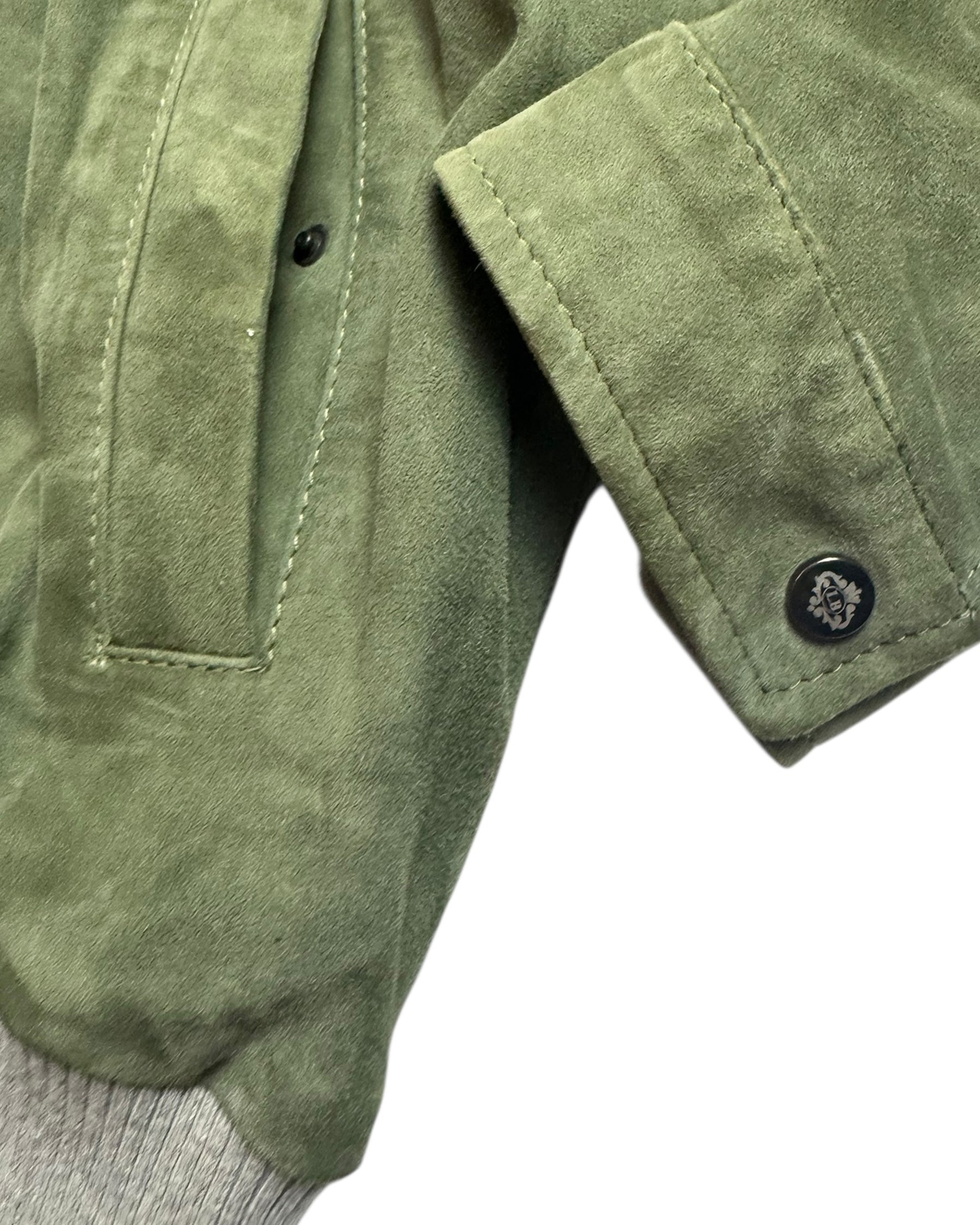Sartorial: Genuine Luigi Borrelli coat, suede, green with gray detail, double zip and logo button front closure, two front slash button pockets, interior pocket, logo button cuffs, amazing tailoring, hand made in Italy. Sartorial quality men sport jackets and suits by Luigi Borrelli. Shop Bespoke Sport Coats.