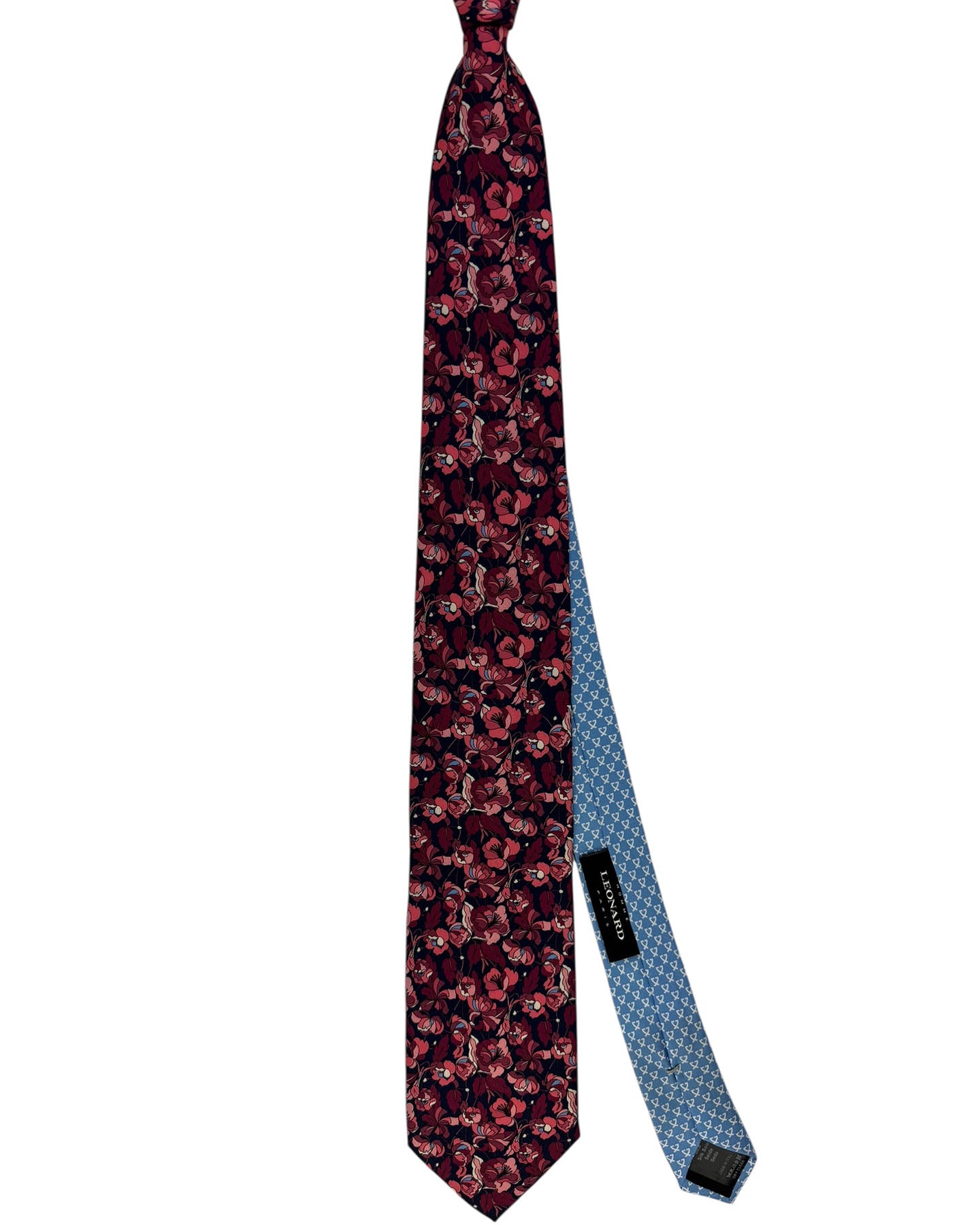 Authentic Leonard tie, rich navy blue background completely covered with densely packed flowers in shades of coral pink, burgundy, magenta, and rose, accented with light blue and white details, luxury printed silk, hand made in Italy. Luxury accessories, hand made in Italy: Leonard Paris is known for it stunning colorful and unique floral designs.
