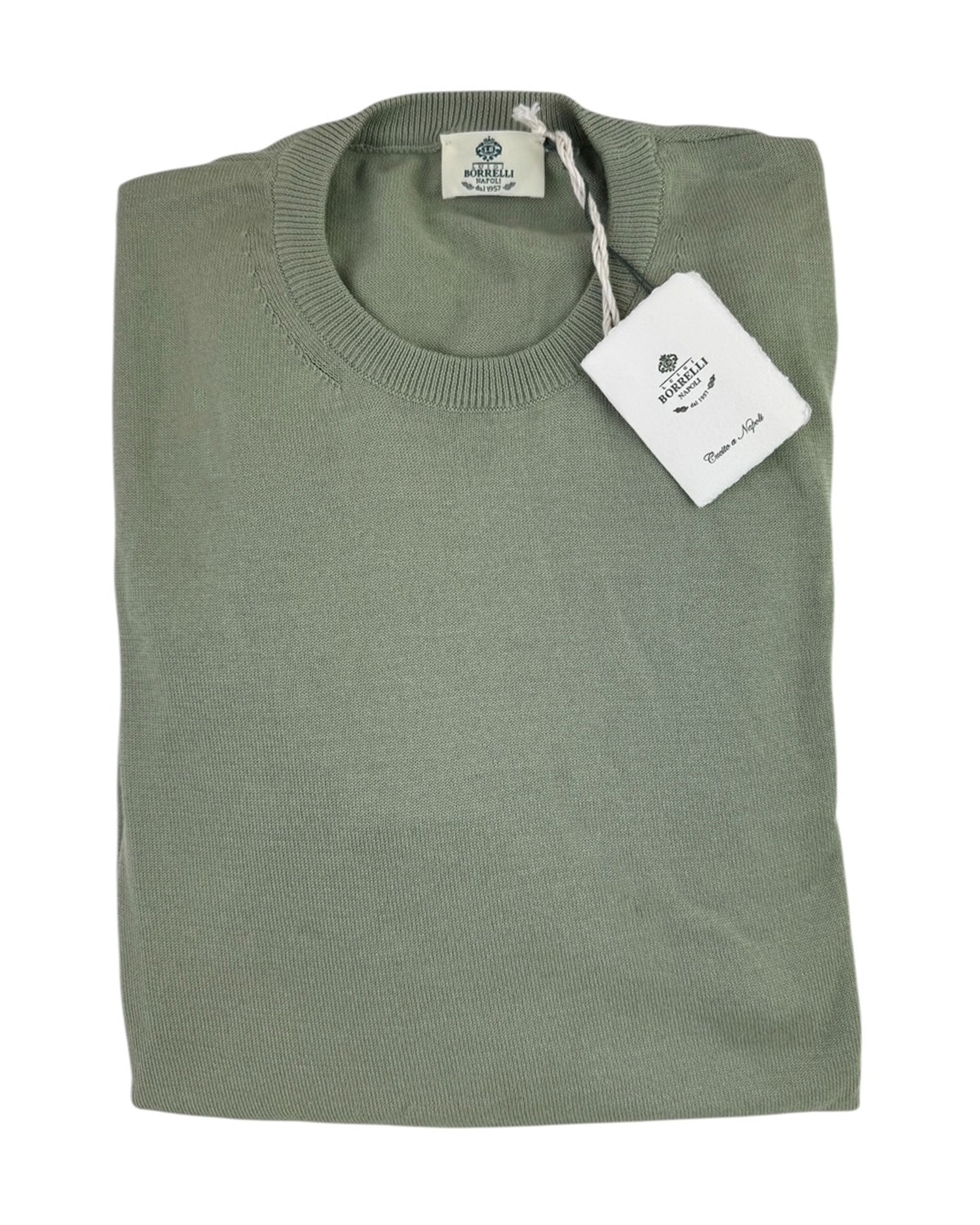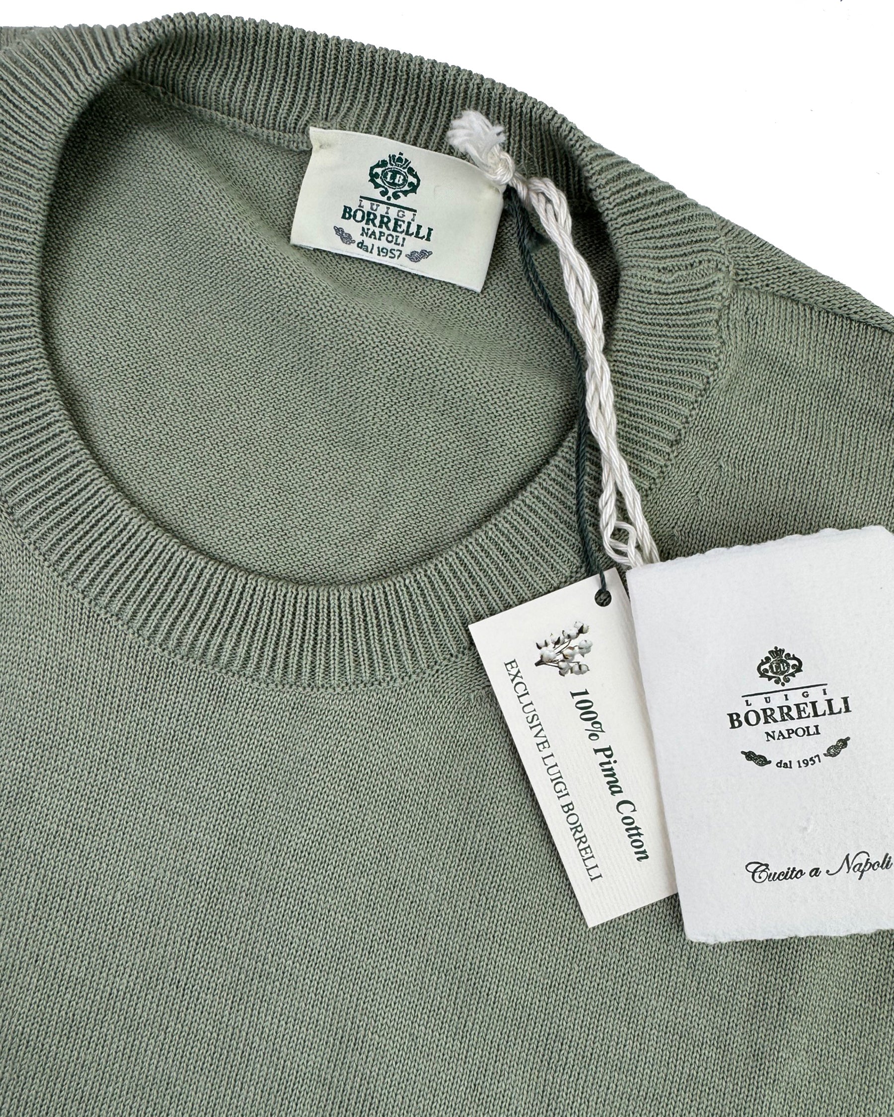 Authentic Luigi Borrelli sweater, sage green, long sleeve, modern fit, fancy exclusive Pima cotton, made in Napoli, Italy. Shop the sartorial dress shirts, sweaters and ties of the Luigi Borrelli men collection.