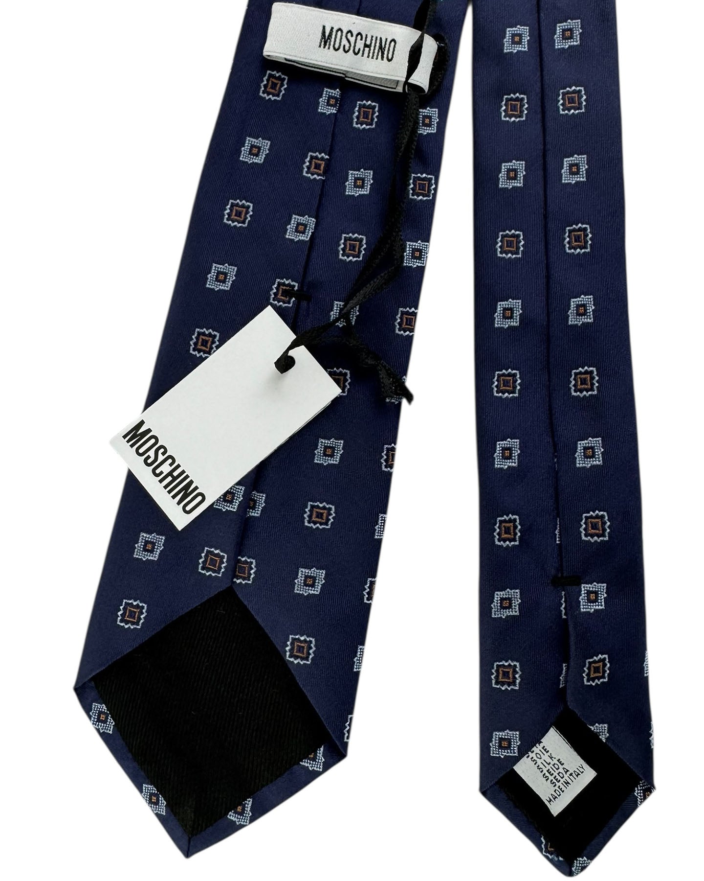 SALE - Men Collection:Genuine Moschino tie, navy geometric, hand made in Italy. New Moschino men collection: silk designer ties. Discount Italian designer ties.