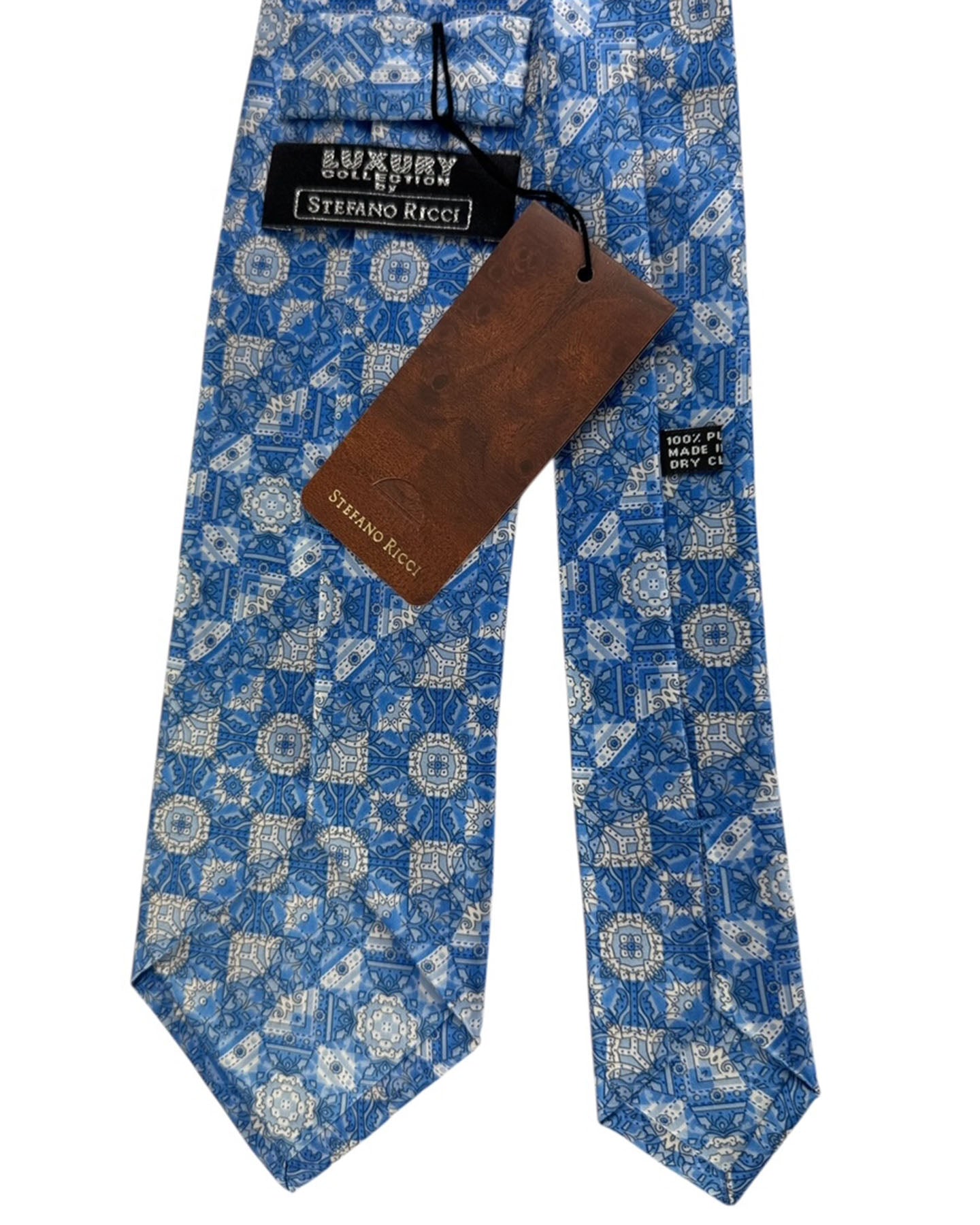 Genuine Stefano Ricci tie, blue design showcasing elaborate tiles in shades of blue , printed silk, hand made in Italy. Authentic Stefano Ricci ties at outlet prices. Luxury men designer ties and accessories.