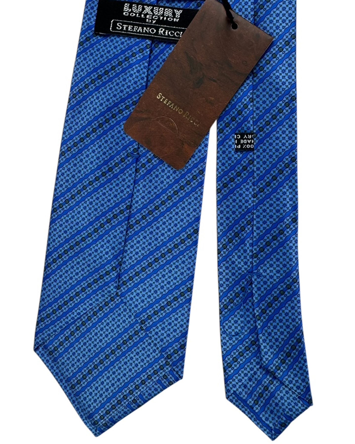 Luxury: Stefano Ricci tie, royal blue silk tie showcasing diagonal stripes accented with light blue bands containing delicate green geometric and floral designs, self tipped, hand printed silk, hand made in Italy. GenuineStefano Ricci ties at outlet prices. Luxury men ties and accessories.