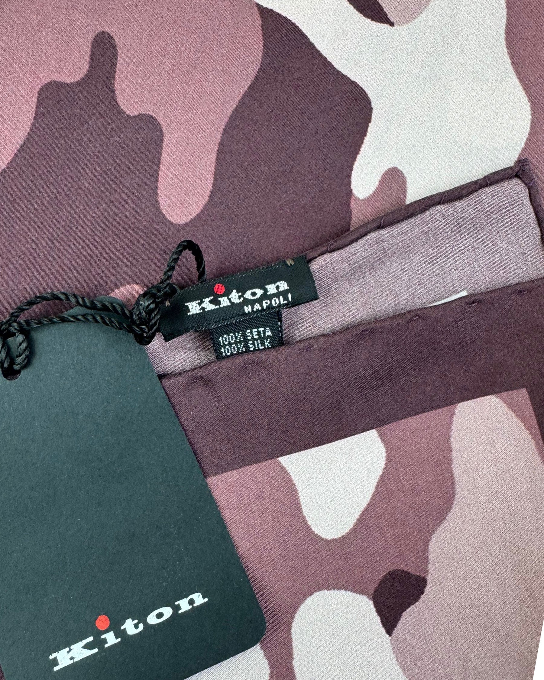Authentic Kiton pocket square, silk, dust pink/ brown camo design, hand stitched borders, made in Italy. Genuine Kiton sartorial men's clothing and accessories. Discount designer pocket squares/ hankies, Italian fashion accessories for men.