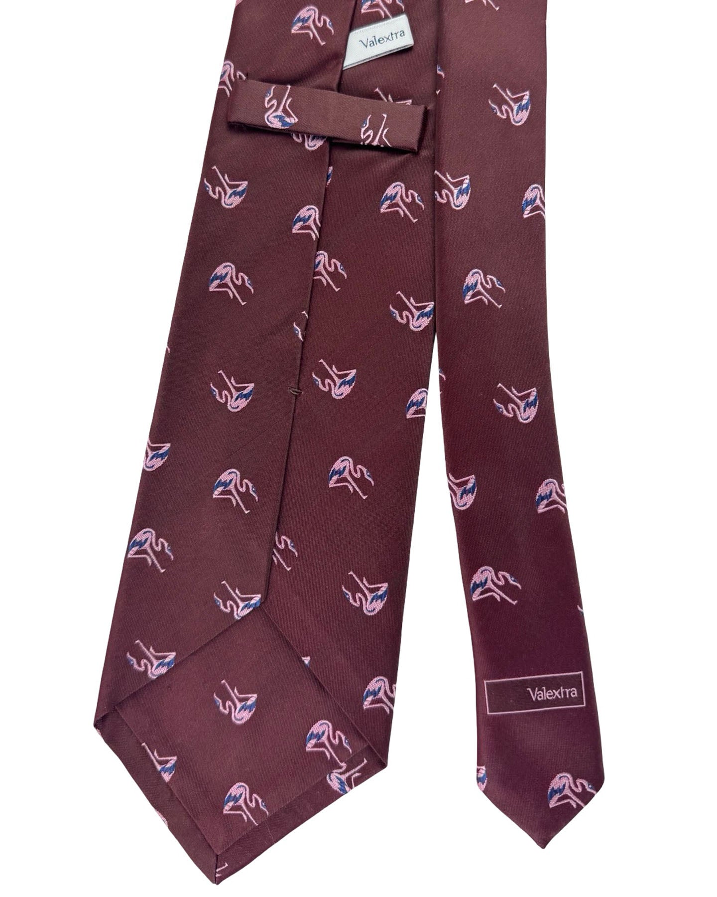 SALE - Genuine Valextra tie, burgundy brown background with pink flamingo, wide 9.5cm width, silk, self tipped, high quality, hand made in Italy. Discount luxury designer ties, Valextra men fashion accessories at outlet prices.