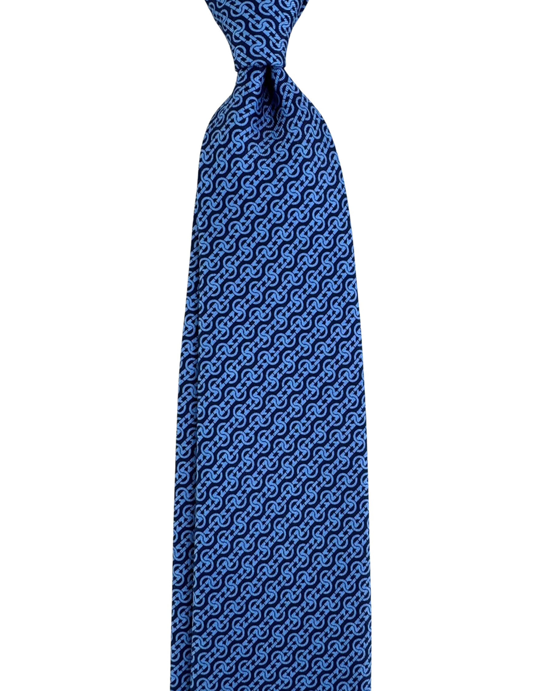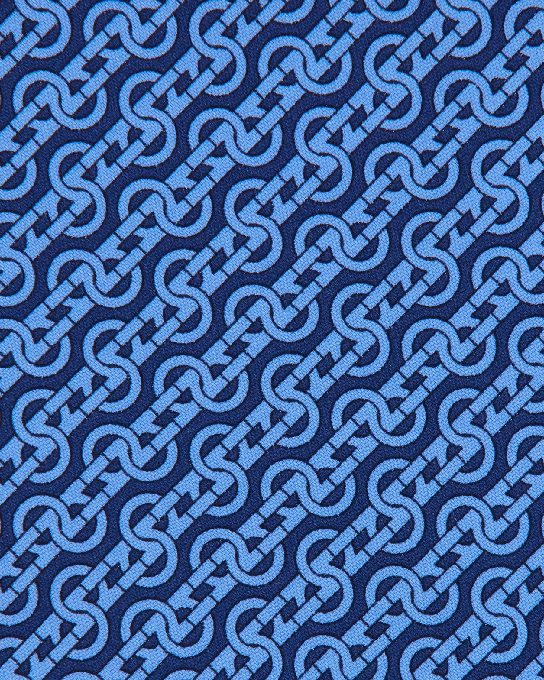 Pure silk twill tie with a diagonal pattern of interwoven Gancini accents in a long chain. The diagonal placement brings regimental motifs to mind.