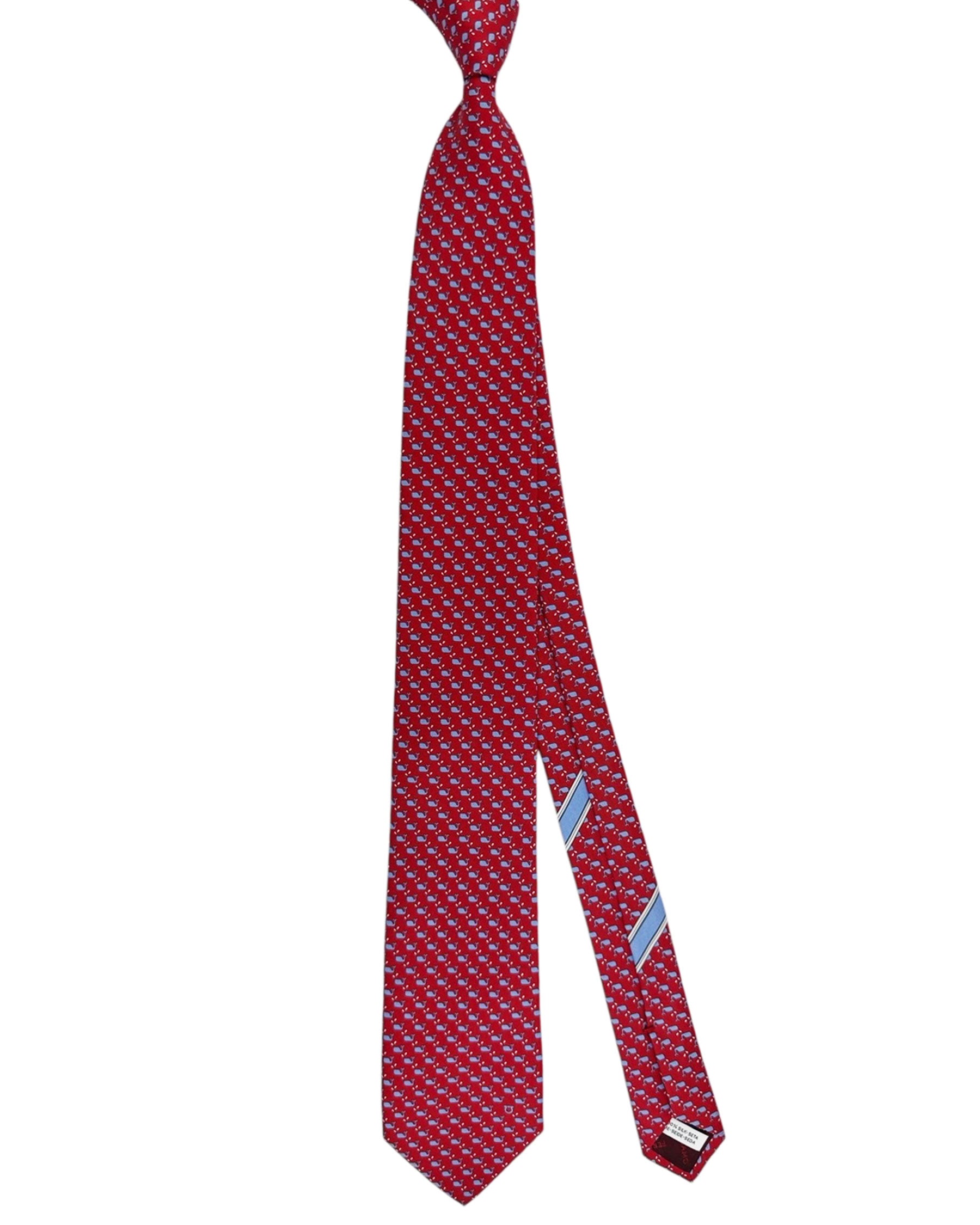 New Fall/ Winter 2025/ 2026 Collection: Authentic Salvatore Ferragamo tie, red with blue whale design, twill silk, hand made in Italy. Genuine discount Ferragamo ties online, Ferragamo men collection at outlet prices. The most popular high-end novelty tie in the world.
