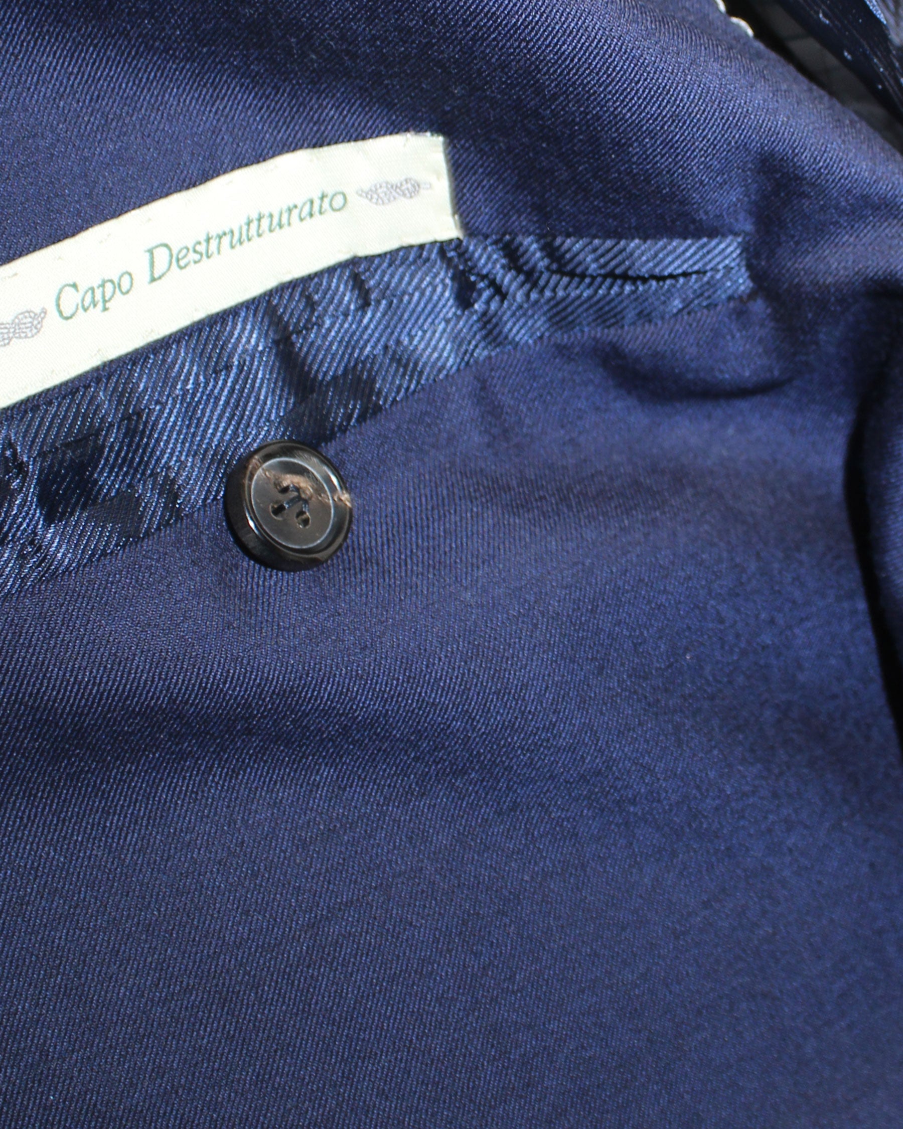 Genuine Luigi Borrelli sport coat, 2 button front, "Capo Destrutturato", navy design, fancy wool/ silk, unlined, bucket pockets, button cuffs, sartorial, LB logo behind back of collar, hand made in Italy. Sartorial quality men sport jackets and suits by Luigi Borrelli. Shop Bespoke Sport Coats.