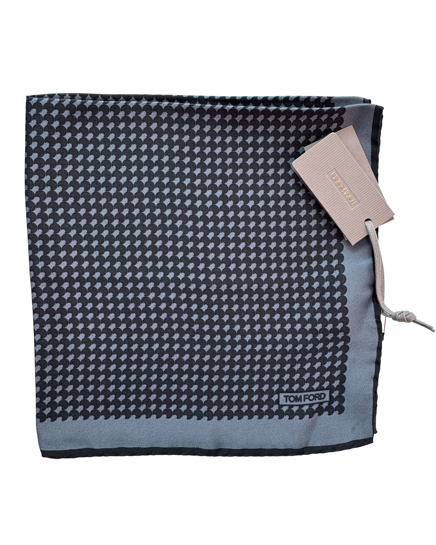 Genuine Tom Ford silk pocket square, blue and charcoal repeating geometric scale, hand stitched border, hand made in Italy. Authentic Tom Ford men collection online at outlet prices. Shop Tom Ford pocket squares.