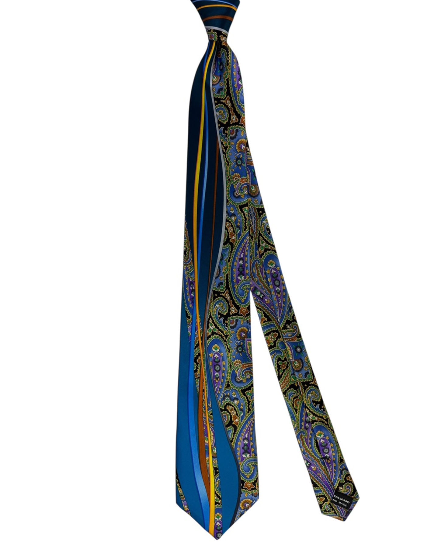 Authentic Vitaliano Pancaldi tie, blue silk adorned with a spectacular intricate paisley designs in royal blue, purple, green, and gold on one side, paired with bold navy, light blue, and orange vertical stripes on the other, hand made in Italy. Genuine Vitaliano Pancaldi ties are luxury Italian designer neckties. Shop all Vitaliano ties.
