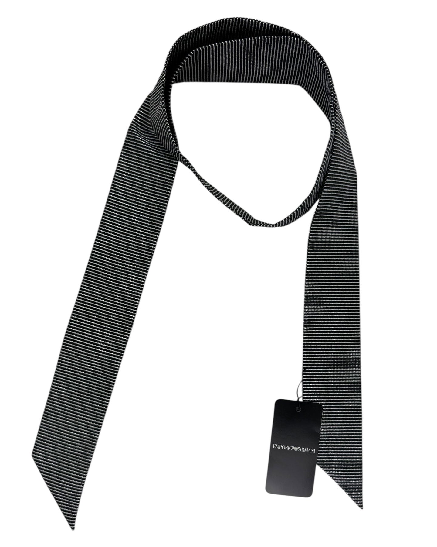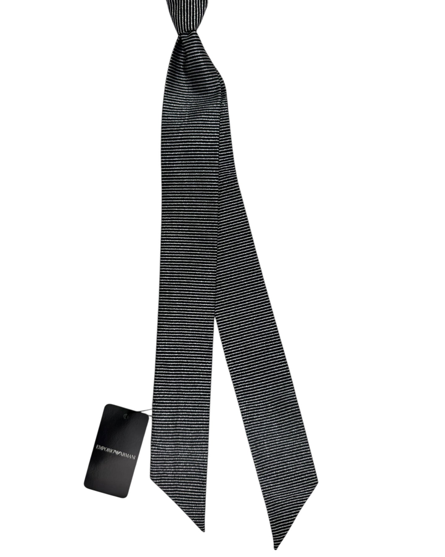 Genuine Emporio Armani tie/ neck scarf, black silver stripes, straight cut scarf/ tie, silk, hand made in Italy. Luxury Armani men collection online. Discount men designer ties.
