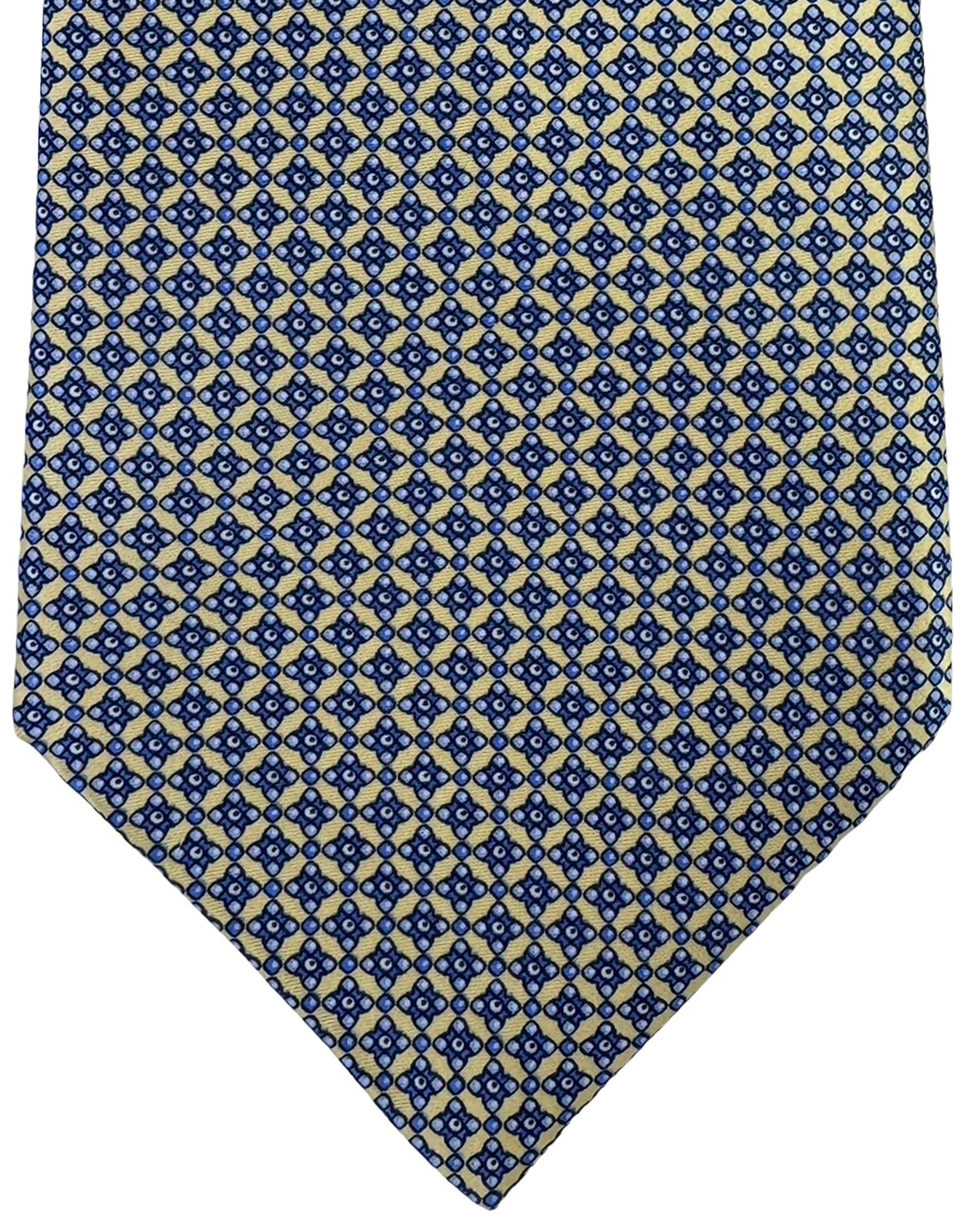 Authentic Stefano Ricci tie, cream background covered with small repeating blue diamond motifs, printed silk, hand made in Italy. Genuine Stefano Ricci ties at outlet prices. Luxury men designer ties and accessories.